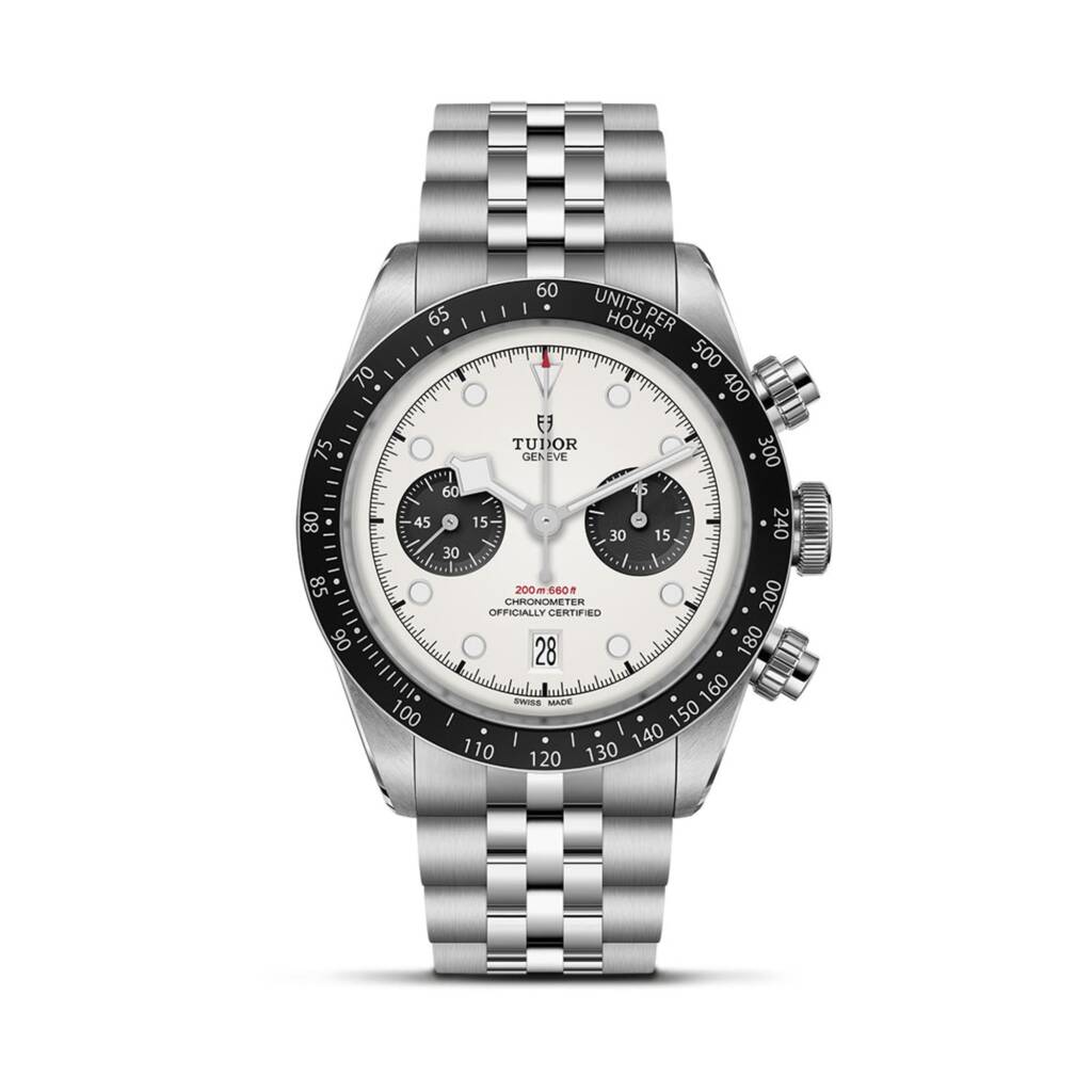 Krone: Feststehende Lünette in Edelstahl mit Zahlenscheibe aus mattschwarz eloxiertem Aluminium, Tachymeterskala, Indizes in Silber, Verschraubbare Aufzugskrone in Edelstahl mit TUDOR Rose im Relief