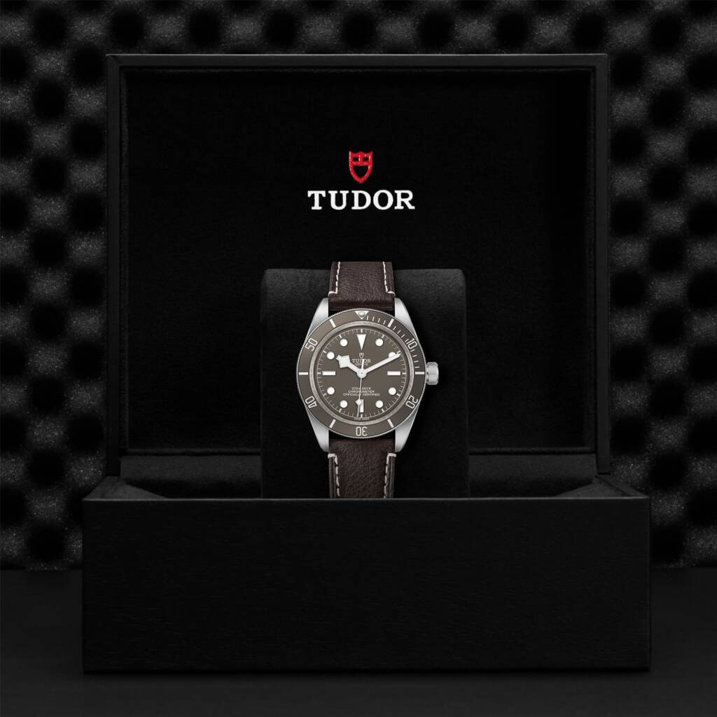 Krone: In eine Richtung drehbare Lünette in 925er Silber mit Zahlenscheibe aus eloxiertem Aluminium in mattem Taupe, 60-Minuten-Graduierung und Ziffern in vergoldetem Silber, Verschraubbare Aufzugskrone in 925er Silber mit gravierter TUDOR Rose im Relief und Kronentubus aus kreisförmig satiniertem 925er Silber