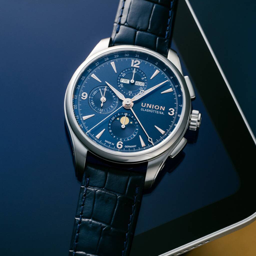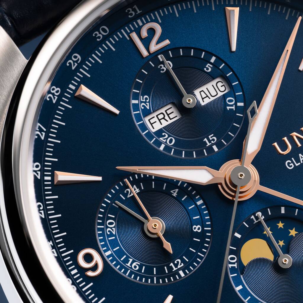 Funktionen: 3-Zeiger, Chronograph, Mondphase,Datum, Datum, Chronograph, Mondphase, Kleine Sekunde, Siliziumspirale, Tag, Chronograph 60 Sekunden, 30-Minuten- und 12-Stunden-Zähler